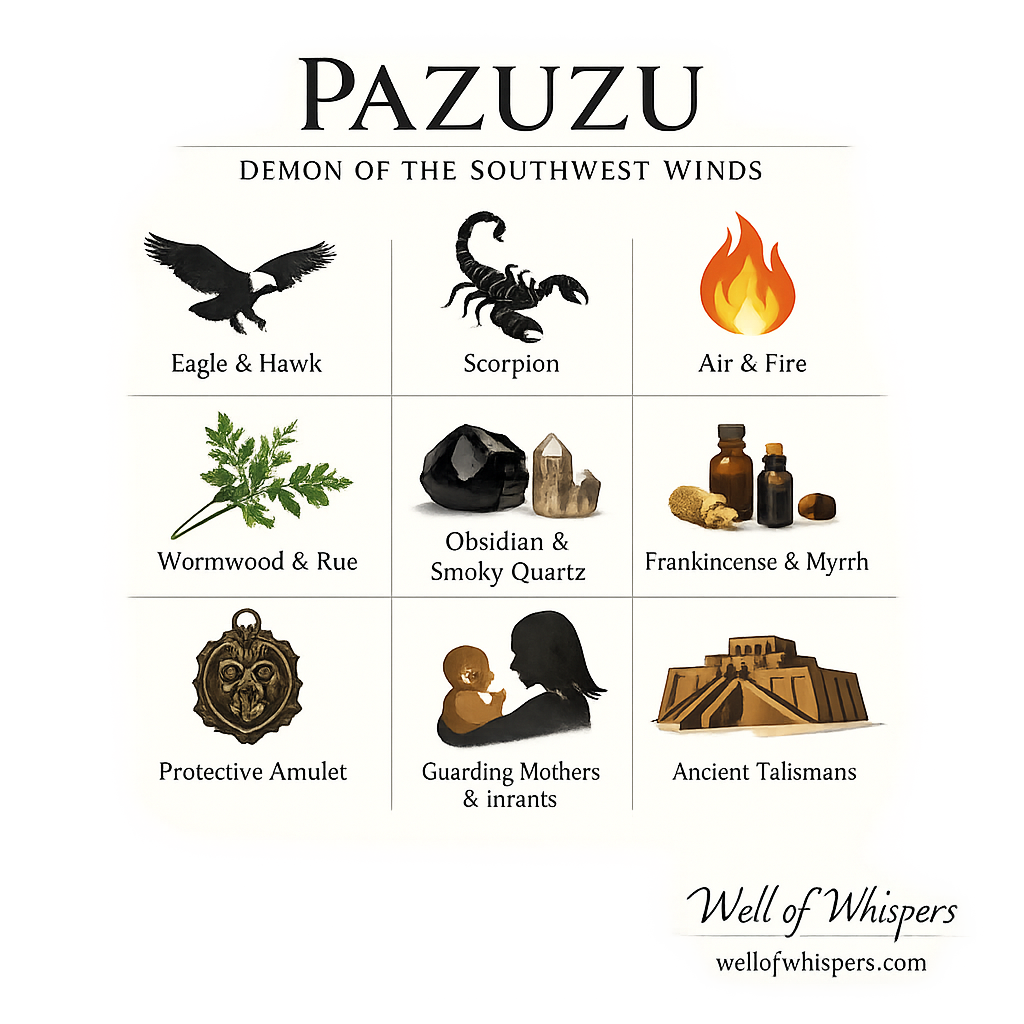 Pazuzu’s correspondences draw from both his domain and his paradox. Air and fire align with his nature, representing the destructive wind and the burning fever he could control. The eagle, hawk, and scorpion were sacred to him for their watchful and combative aspects. Herbs like wormwood and rue—bitter, pungent, and protective—were believed to help drive off pestilence. Obsidian and smoky quartz, dark stones that absorb and ground chaotic energy, resonate with his deflective power. Oils such as frankincense and myrrh, used in both purification and funerary rites, reflect his connection to barriers between the living and the unseen.