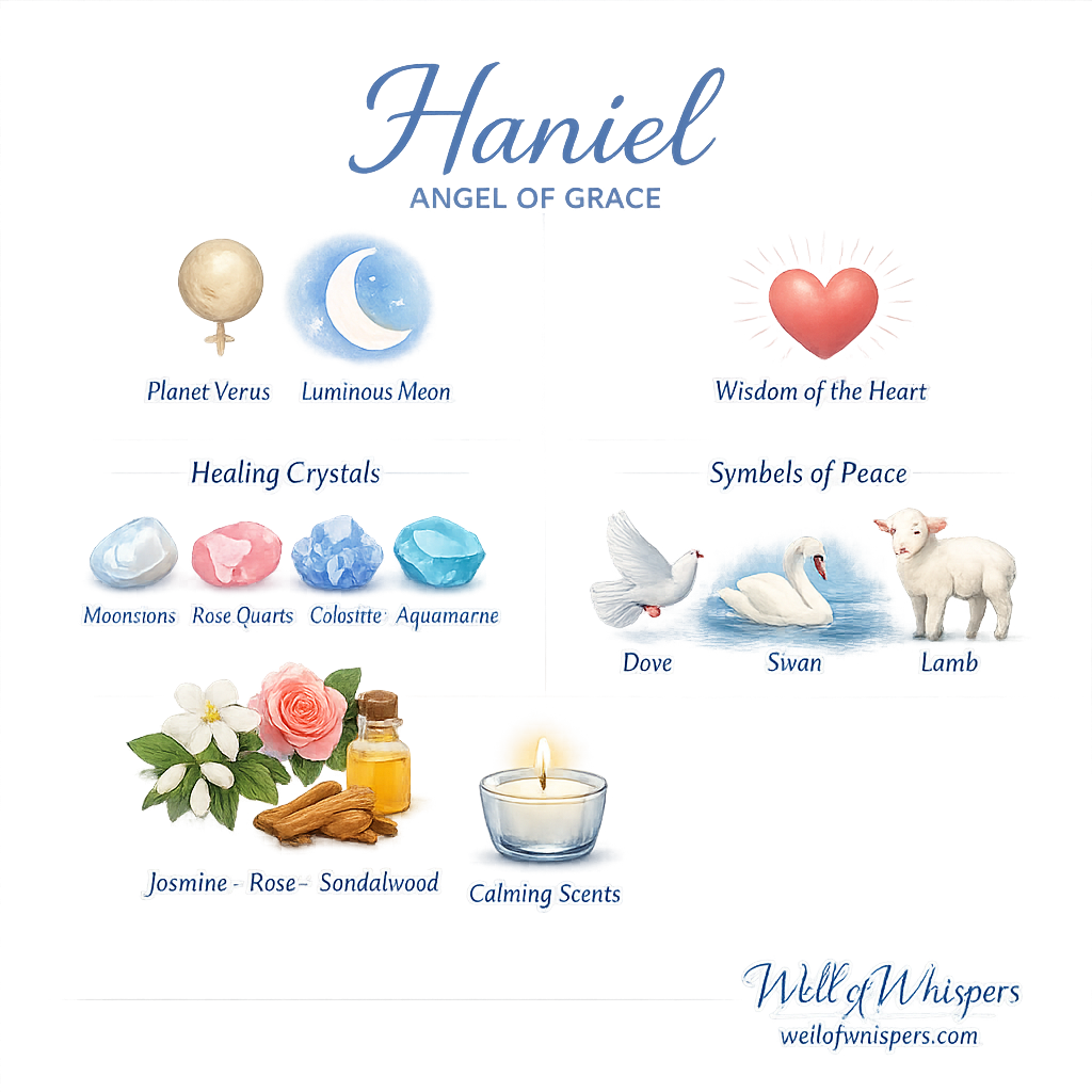 Animals that reflect the spirit of Haniel include the dove, the swan, and the lamb—symbols of purity, quiet faith, and loyal endurance. Each of these creatures reminds us that the softest presence can still radiate immense spiritual authority.
